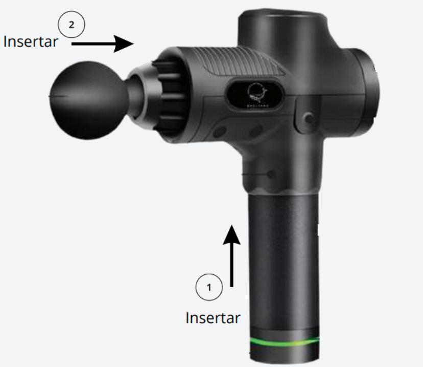 2. Para colocar el cabezal de masaje, apaga el aparato, alinee la parte convexa del cabezal con el orificio de la unidad de masaje manual, introdúcelo lentamente y asegura que todo queda firmemente sujeto.